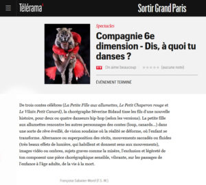 « La Cie 6ème Dimension s’installe à La Villette pour 9 représentations du spectacle Dis, à quoi tu danses? créé en 2015, autour de l’univers des contes(…). Comme à son habitude Séverine Bidaud créé des «personnages décalés parfois loufoques ou bien encore irréels, mi-hommes, mi-animaux », bouleversant parfois les codes de la danse hip-hop pour investir un imaginaire poétique et féérique. »